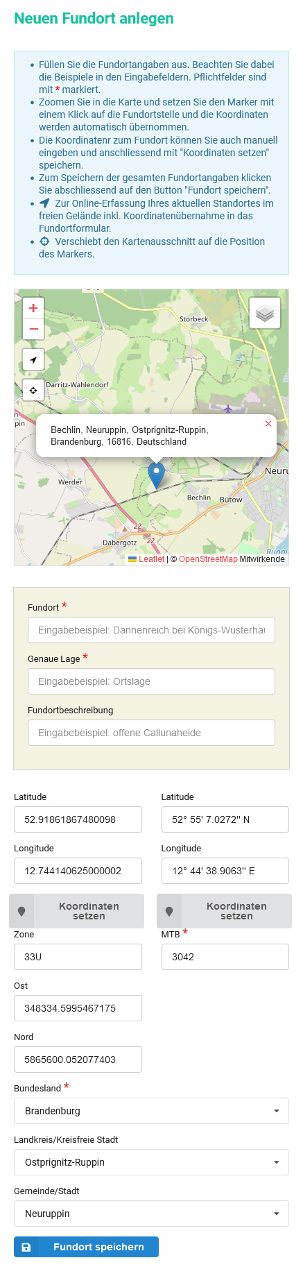- Klicken Sie auf die Markerposition und die Koordinaten, inkl. Bundesland werden automatisch im Formular übernommen. Geben Sie Ihre gewünschten Bezeichnungen für den Fundort und die genau Lage ein und speichern Sie abschließend die Angaben.